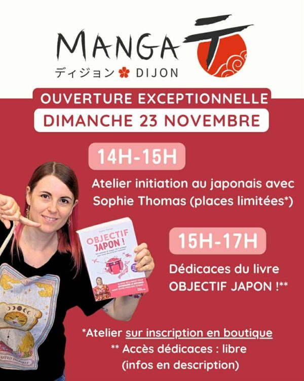 Le dimanche 23 novembre, SOPHIE fait le déplacement chez Manga-T à Dijon, afin de te proposer un atelier d’initiation au japonais juste avant la dédicace de son livre !